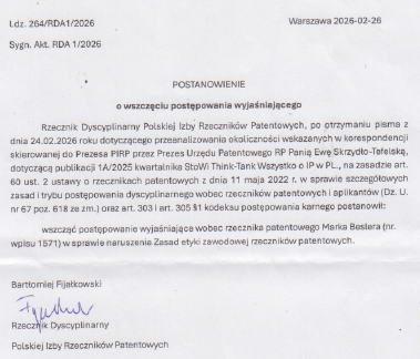 W odpowiedzi na pismo otrzymane w Wielki Piątek (dnia 03.04.2026 r. tj. 14 dni temu) zawierające odpis z „POSTANOWIENIA o wszczęciu postępowania wyjaśniającego” (sygn. akt RDA 1/2026), które podpisał rzecznik patentowy Bartłomiej FIJAŁKOWSKI (posługujący się tytułem „Rzecznik Dyscyplinarny PIRP”) oraz w odpowiedzi na pytania z dnia 26.02.2026 r.,