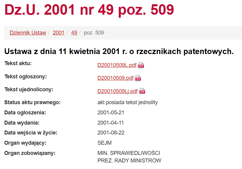 [Ustawa z dnia 11 kwietnia 2001 r. o rzecznikach patentowych (Dz.U. z 2024 r. poz. 749)]: