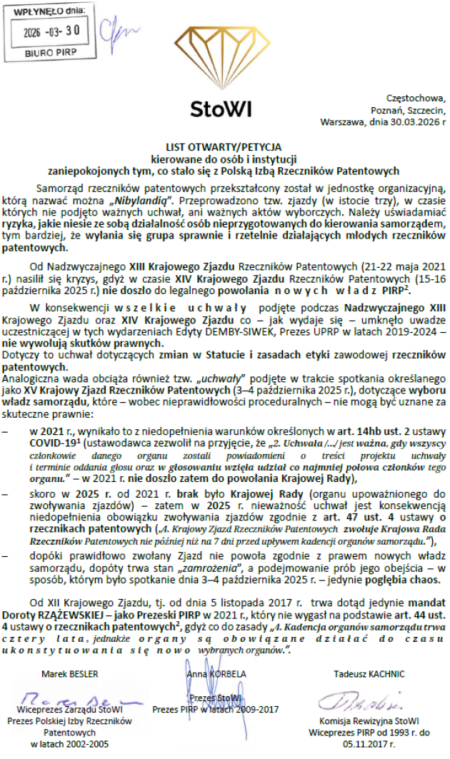 - Brak podstawy prawnej działania osoby przedstawiającej się jako „Rzecznik Dyscyplinarny Polskiej Izby Rzeczników Patentowych”